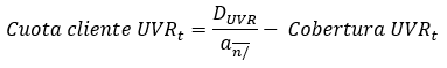 Cuota_Cliente_UVRt se calcula como una anualidad uniforme ordinaria en UVR menos la cobertura en UVR al momento t, conforme se establece en la siguiente expresión: