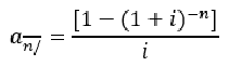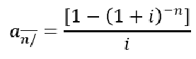 = Corresponde al valor presente de n pagos uniformes unitarios periódicos a la tasa efectiva mensual i, calculados de acuerdo con la siguiente expresión: