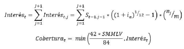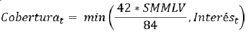 = Es el monto en pesos correspondiente a la cobertura que se calcula como el mínimo entre el monto mensual definido de acuerdo con el Salario Mínimo Mensual Legal Vigente (SMMLV) al momento del desembolso del crédito y los intereses efectivamente causados en el tiempo