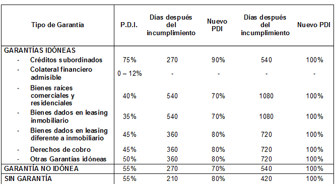 | Tipo de Garantía | P.D.I. | Días después del incumplimiento | Nuevo PDI | Días después del incumplimiento | Nuevo PDI |