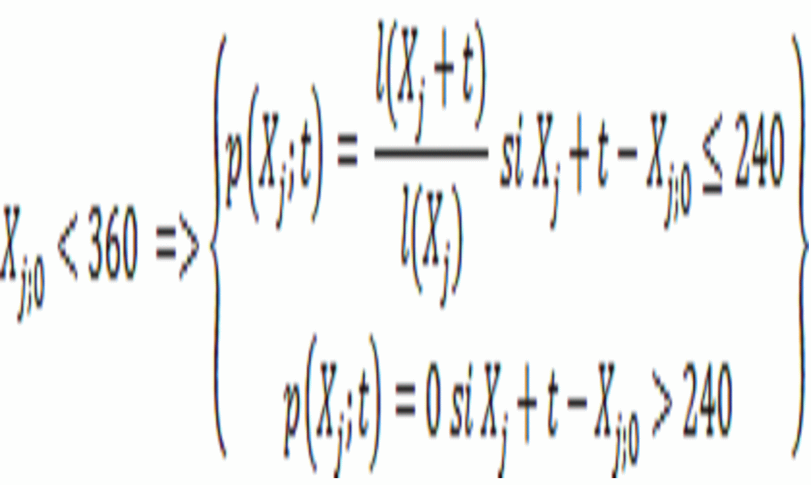 3.2.3.1. Probabilidad de sobrevivencia: La probabilidad de que un individuo de edad “x” sobreviva hasta la edad “x + t” se determina de acuerdo la siguiente fórmula: