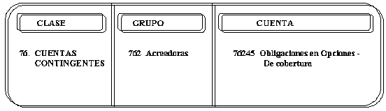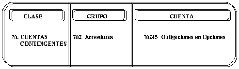 | CREDITOS 1. Por el valor acordado de la obligación derivado de los contratos, tanto de opciones emitidas como compradas. 2. Por el incremento en el valor de la obligación a precios de mercado, con cargo a la cuenta 76105 -Acreedoras por Contra (DB)-. | DEBITOS 1. Por la disminución en el valor de la obligación en la valoración a precios de mercado, con abono a la cuenta 76105 -Acreedoras por Contra (DB)-. 2. Por la cancelación del contrato. |