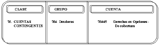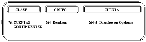 | DEBITOS 1. Por el valor acordado del derecho derivado de los contratos, tanto de opciones emitidas como compradas. 2. Por el incremento en el valor del derecho en la valoración a precios de mercado, con abono a la cuenta 76305 -Deudoras por Contra (CR)-. | CREDITOS 1. Por la disminución en el valor del derecho en la valoración a precios de mercado, con abono a la cuenta 76105 -Acreedoras por Contra (DB)-. 2. Por la cancelación del contrato. |