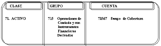 | CREDITOS Por la variación a precios justos de intercambio de los contratos celebrados en operaciones con derivados de cobertura. | DEBITOS 1. Por la variación a precios justos de intercambio de los contratos celebrados en operaciones con derivados de cobertura. 2. Por la cancelación de saldos al cierre del ejercicio. |