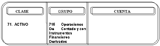 | DEBITOS 1. Por el valor determinado del derecho (7151505 a la 7151520). 2. Por el valor del ajuste en la valoración del derecho y la obligación de acuerdo a los parámetros establecidos, según el caso. 3. Por el valor actualizado de la obligación para trasladar al grupo 723, cuando este sea mayor al valor actualizado del derecho. 4. Por la cancelación del contrato. | CREDITOS 1. Por el valor de la obligación a precios de mercado (7151525 a la 7151540). 2. Por el valor del ajuste en la valoración de la obligación y el derecho de acuerdo a los parámetros establecidos, según el caso. 3. Por el valor actualizado del derecho para trasladar al grupo 723. 4. Por la cancelación del contrato. |