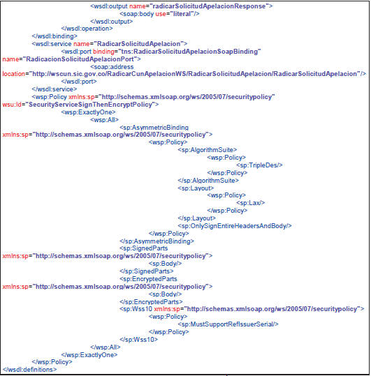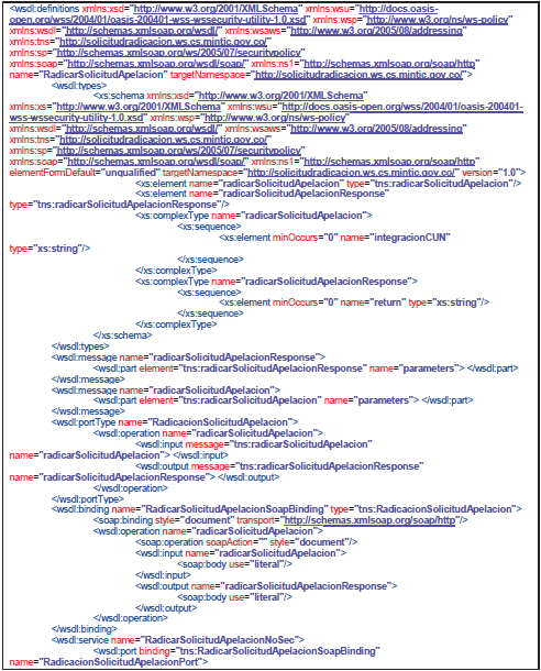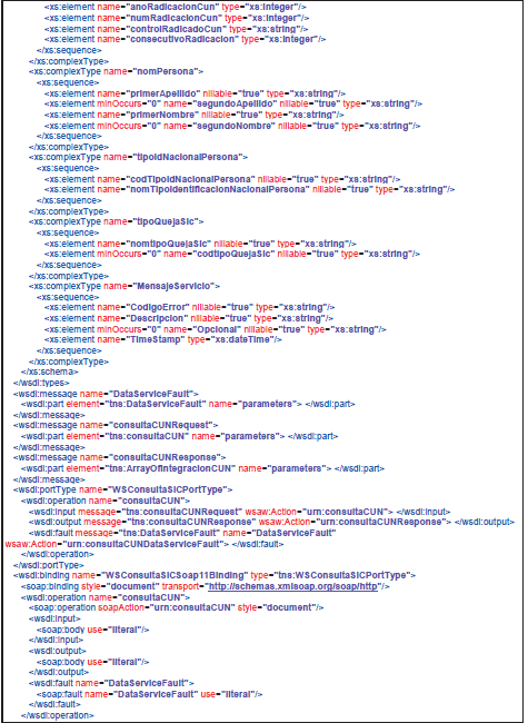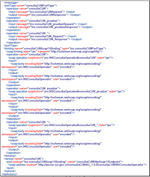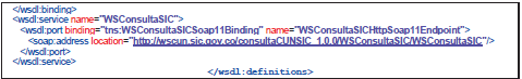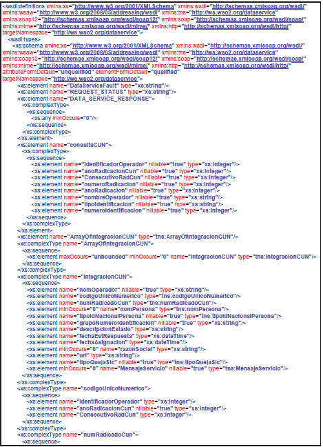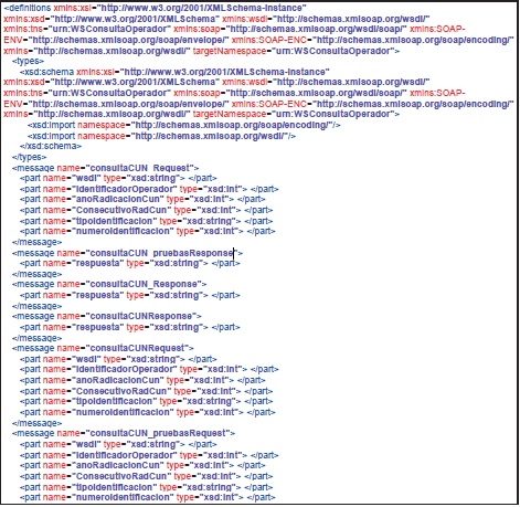 - Contrato de servicio o wsdl: WSDL (en ocasiones leído como como wisdel) son las siglas de Web Services Description Language, un formato XML que se utiliza para describir servicios Web. La versión 1.0 fue la primera recomendación por parte del W3C y la versión 1.1 no alcanzó nunca tal estatus. La versión 2.0 se convirtió en la recomendación actual por parte de dicha entidad. WSDL describe la interfaz pública a los servicios Web. Está basado en XML y describe la forma de comunicación, es decir, los requisitos del protocolo y los formatos de los mensajes necesarios para interactuar con los servicios listados en su catálogo. Las operaciones y mensajes que soporta se describen en abstracto y se ligan después al protocolo concreto de red y al formato del mensaje. Así, WSDL se usa a menudo en combinación con SOAP y XML Schema. Un programa cliente que se conecta a un servicio web puede leer el WSDL para determinar qué funciones están disponibles en el servidor. Los tipos de datos especiales se incluyen en el archivo WSDL en forma de XML Schema. El cliente puede usar SOAP para hacer la llamada a una de las funciones listadas en el WSDL. El WSDL nos permite tener una descripción de un servicio web. Especifica la interfaz abstracta a través de la cual un cliente puede acceder al servicio y los detalles de cómo se debe utilizar.