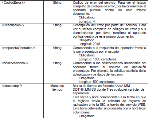 | Error en radicación en la SIC | El servicio envía mensaje a área de soporte técnico. En este punto ya se han validado los datos y se ha realizado la transferencia de los archivos, por tanto se acepta la radicación con fecha de la solicitud. | 0 a 2 días. |