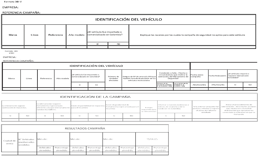 a) Los productores o fabricantes, ensambladores, importadores y representantes de productor de vehículos deberán diligenciar y remitir vía electrónica en formato Excel, al correo automotor@sic.gov.co., según corresponda, los formatos 3ID-V, o 3ID-VCRC, 3DIV-C Y 3CRO-C los cuales conforman el formato “Remisión Campaña de Seguridad Vehículos”, contenido en el Anexo No. 1.6 de la presente Circular.