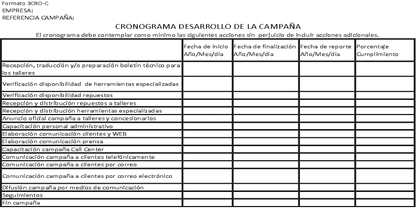 El formato “Remisión Campaña de Seguridad Vehículos” tiene por objeto fijar el mínimo de información que debe contener el reporte de la Campaña de Seguridad, en el cual se debe especificar la falla, línea y modelo del vehículo involucrado, número de unidades en circulación, cronograma de aplicación, entre otros;
