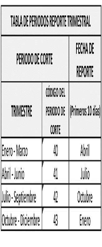 -- Archivo tipo 543: trimestralmente, dentro de los primeros diez (10) días calendario del mes posterior a la finalización del periodo a reportar, si la fecha de reporte es un día no hábil (sábado, domingo o festivo), este se realizará al siguiente día hábil de la fecha de corte (Ver Tabla Periodos de Reporte Trimestral).