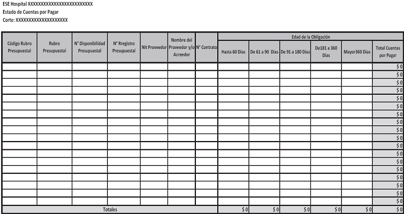 6. Estado de las cuentas por pagar de la institución con corte al último día del mes objeto de reporte, separándolas por concepto y edad de las cuentas, de acuerdo con el formato anexo a la presente Circular.