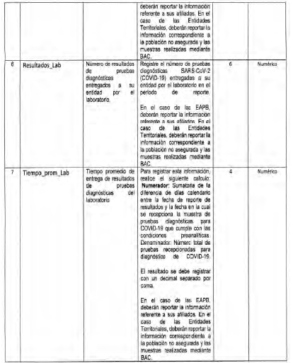 De igual manera, el Ministerio de Salud y Protección Social en los literales d) y k) del artículo 3o de la Resolución número 676 de 2020 dispone que corresponde a las secretarías de salud o las entidades que hagan sus veces, Red Nacional de Laboratorios, entidades promotoras de salud del Régimen Contributivo y Subsidiado, entidades pertenecientes al Régimen Especial y de Excepción en salud, entidades que administran planes adicionales de salud, prestadores de servicios de salud públicos, privados y mixtos, Instituto Nacional de Salud, así como otras entidades que generen, operen o provean información relevante para el seguimiento de la pandemia de COVID-19, realizar el reporte de: “casos diagnosticados por laboratorio para COVID-19, a partir de la base de datos de resultados generados por los laboratorios de la Red Nacional de Laboratorios (...)”, así como reportar la “Capacidad instalada de laboratorios disponibles y pruebas diagnósticas para COVID-19 y otros virus respiratorios registrados a través de RELAB (...)” en concordancia con la Resolución número 561 de 2019. En el artículo 6o de la misma resolución, se delega a la Superintendencia Nacional de Salud como entidad responsable de realizar la inspección, vigilancia y control correspondiente.