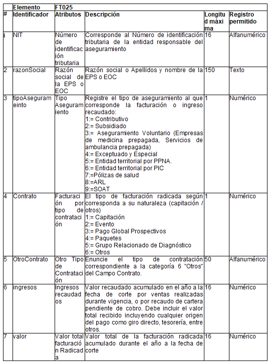 Archivo Tipo FT025 - Reporte de Facturación Radicada por IPS a entidades del aseguramiento en salud del capítulo (iv) Instituciones Prestadoras de Servicios de Salud, del Título Xl-Anexos Técnicos