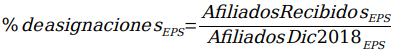 Dónde, AfiliadosRecibidosEPS corresponde al total de afiliados asignados a la EPS receptora desde el 1 de enero de 2019 al 31 de julio de 2022; AfiliadosDic 2018EPS corresponde al total de afiliados de la EPS receptora en estado activo, protección laboral, suspendido, suspendido por documento y suspendido por mora a diciembre de 2018;% deasignacionesEPS corresponde a la variación total de la EPS de asignaciones en el periodo respecto a la población afiliada a diciembre 31 de 2018.
