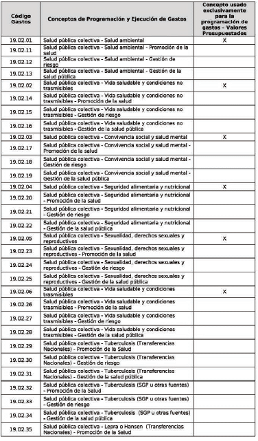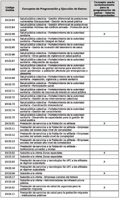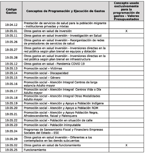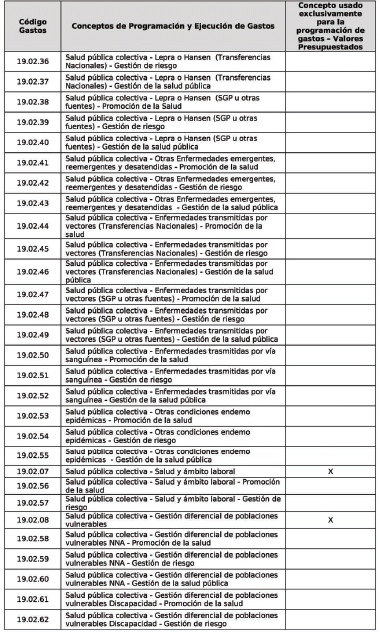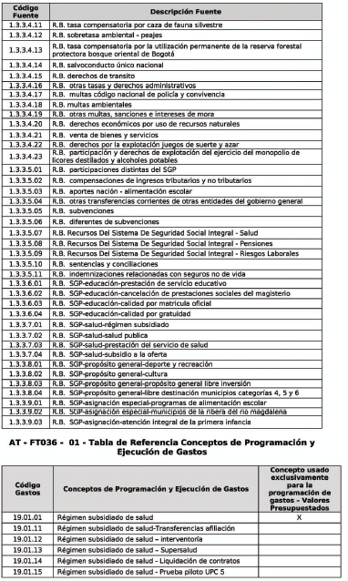 | 1 | codGasto | Código Gastos | Corresponde al código del concepto de acuerdo con la tabla AT-FT036 - 01: Tabla de Referencia Conceptos de Programación y Ejecución de Gastos. | 8 | numérico |