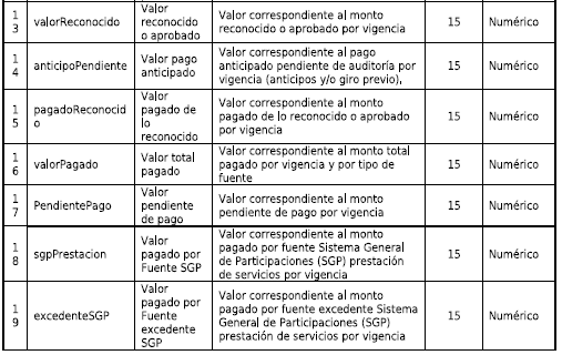 | 6 | Pago | Valor del pago | Valor pago por concepto, al cierre del periodo para cada uno de los códigos gastos. | 15 | numérico |