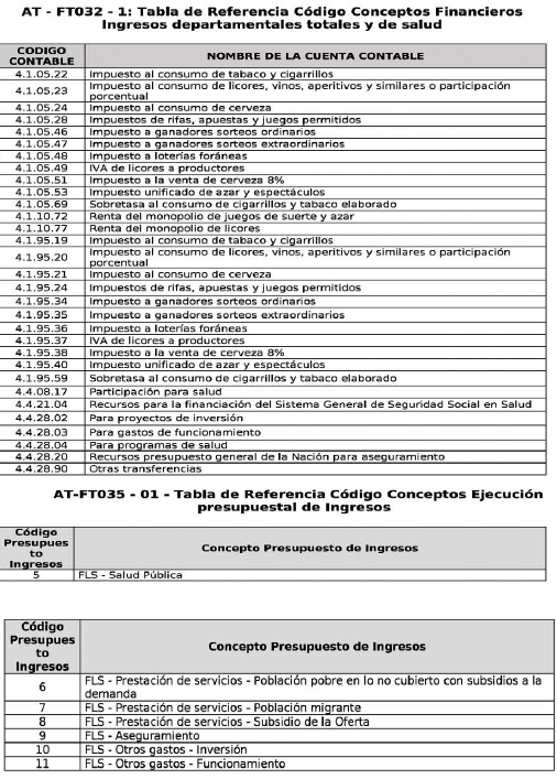 | 1 | Código Contable | Código del concepto contable | Corresponde al código contable y nombre de la cuenta relacionados en la tabla AT-FT032-01: Tabla de Referencia Código Conceptos Financieros Ingresos departamentales totales y de salud. | 9 | Alfanumérico Ver Tabla de Referencia AT- FT032- 01 Código Conceptos Financieros Reportar únicamente los códigos que presenten saldo diferente a cero (0) |