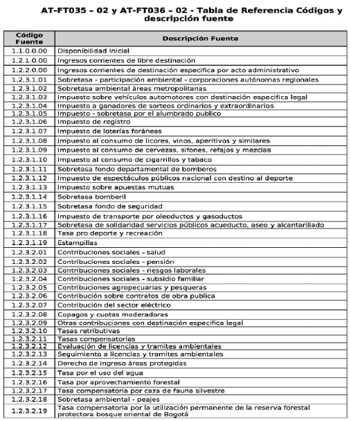 | 2 | codFuente | Código de la fuente | Corresponde al código de la fuente y a la descripción de la fuente relacionados en la tabla AT-FT035 - 02: Tabla de Referencia Códigos y descripción fuente. | 10 | Alfanumérico |