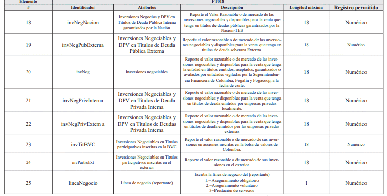 | 20 | inversionReservas | Inversión de las Reservas Técnicas | En caso de que sea una inversión que respalde las Reservas Técnicas, por favor indique el monto en el que las respalda, de lo contrario reportar en cero “0” 0: = No aplica para SAP, EMP, IPS, Gestores Farmacéuticos y Operadores Logísticos de Tecnologías en Salud. | 18 | Numérico |