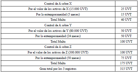 Con base en lo anterior, la multa que tendría que pagar A por la normalización de los tres registros anteriores sería la siguiente: