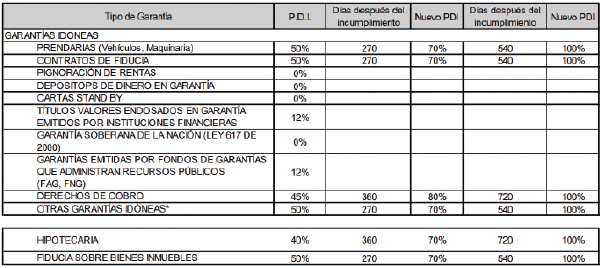 La PDI para los deudores considerados “incumplidos” tendrá un aumento paulatino, de acuerdo con los días trascurridos después de su incumplimiento, y según el tipo de garantía idónea, como se describe en la tabla anterior.