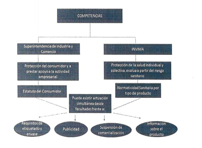 Se indica a continuación un esquema donde podemos observar las competencias de ambas entidades de forma independiente, pero con la salvedad que pueden actuar simultáneamente desde el punto de vista de sus facultades, caso concreto, la información, publicidad de productos, requisitos de etiquetado y envases, suspensión de comercialización y producción de productos, entre otros.
