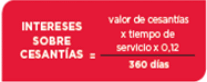 Con respecto a esta prestación social, el empleador debe pagar a más tardar el 30 de enero de cada año, el 12% anual (1% mensual) sobre los saldos que, a 31 de diciembre de cada año, o en las fechas de retiro del trabajador o de la liquidación parcial de cesantías, tenga el trabajador a su favor por concepto de cesantías. Si no los cancela oportunamente, deberá pagar al trabajador a título de indemnización y por una sola vez, un valor adicional igual al de los intereses causados, cuya fórmula para liquidar es: