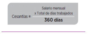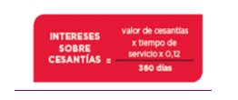 Con respecto a esta prestación social, el empleador debe pagar a más tardar el 30 de enero de cada año, el 12% anual (1% mensual) sobre los saldos que, a 31 de diciembre de cada año, o en las fechas de retiro del trabajador o de la liquidación parcial de cesantías, tenga el trabajador a su favor por concepto de cesantías. Si no los cancela oportunamente, deberá pagar al trabajador a título de indemnización y por una sola vez, un valor adicional igual al de los intereses causados, cuya fórmula para liquidar es: