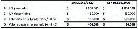 En estos casos, la tarifa de retención en la fuente es del 50% del valor del impuesto sobre las ventas al momento del pago o abono en cuenta, y debe ser practicada por aquellos agentes de retención en el impuesto sobre las ventas. Esta retención en la fuente es aplicable a partir de la expedición del Decreto Legislativo 560 de 2020, esto es, a partir del 15 de abril de 2020 y hasta el 31 de diciembre del mismo año.