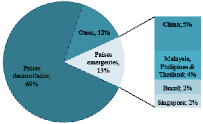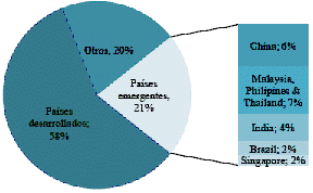 Lo interesante de este comportamiento es que durante este periodo entraron al mercado países emergentes ubicados en zonas tropicales como Malasia, India, China, Brasil y Filipinas, con condiciones ecosistémicas similares a las de Colombia, que en el 2002 participaban con el 18% y en el 2008 con el 34% del mercado. A pesar del creciente dinamismo, las exportaciones colombianas participan en este mercado tan sólo con el 0.3%, donde las principales exportaciones se concentran en aceite de coco (49%) y manteca, grasa y aceite de cacao (26%).(4).