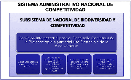 Disponer de una adecuada coordinación y capacidad institucional para el desarrollo comercial de la biotecnología a partir del uso sostenible de los recursos biológicos, genéticos y sus derivados es un elemento clave para avanzar en la cadena de agregación de valor de dichos recursos y a su vez, en la distribución justa y equitativa de los beneficios derivados de su uso. Tal institucionalidad facilita la armonización de las políticas sectoriales involucradas en el uso de la biodiversidad y permite coordinar las acciones correspondientes entre las diferentes autoridades competentes y el sector privado. Lo anterior, además, posibilita la creación de un entorno favorable para las inversiones en este campo, particularmente en lo que se refiere a la creación de empresas de base biotecnológica y al desarrollo de productos a partir recursos biológicos, genéticos y derivados de la biodiversidad colombiana.