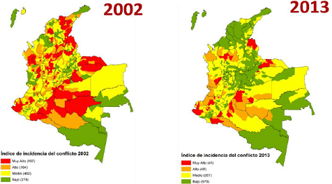 | Mapa 1. Comparativo del Índice de Incidencia del Conflicto, 2002 y 2013...................... | 14 |