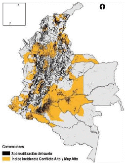 9. La sobreutilización del suelo se calculó a partir del mapa del Instituto Geográfico Agustín Codazzi (IGAC) de Conflictos de Uso del Suelo (2012), en este análisis uno de los conflictos de uso del suelo es la sobreutilización por el desarrollo de actividades agropecuarias y forestales. Por lo tanto, se realizó el cruce de los municipios con alta y muy alta incidencia de conflicto armado y los datos del IGAC (2012). La sobreutilización se presenta cuando zonas de minifundio con vocación agropecuaria se encuentran sobre explotadas, presentándose degradación de los recursos naturales, cuya expresión más evidente es la erosión hídrica (IGAC, 2012) (IGAC, 2012).