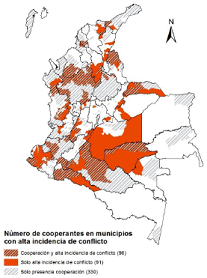 27. A partir del cruce entre presencia de cooperación internacional que suministra el SIAOD con el Índice de Incidencia del Conflicto del DNP, la cooperación internacional está tan solo en el 51% de los 187 municipios con alta afectación histórica por conflicto armado.