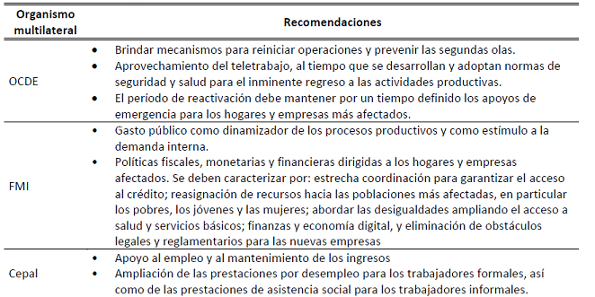 La afectación a la salud de la población por COVID-19, las medidas de autocuidado, y las medidas de contención implementadas por el Gobierno se convirtieron en choques que afectaron el funcionamiento normal de la economía. El primer choque afectó, por un lado, la salud de los trabajadores y los hogares, y por ende sus ingresos al aumentar las ausencias laborales y horas trabajadas; y por el otro, afectó el consumo privado debido al aislamiento voluntario e involuntario. El segundo choque, debido al cierre parcial o total de los negocios, generó impactos diferenciales sobre los sectores productivos y los tipos de empresas. Las finanzas públicas sufrieron un impacto negativo doble, debido a que los ingresos por impuestos cayeron y los egresos para mitigar la crisis económica y de salud aumentaron.