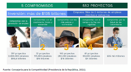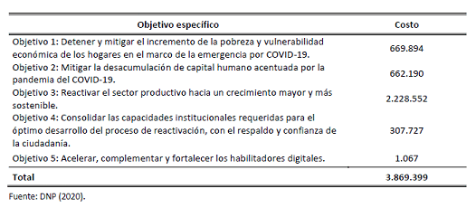 Las acciones propuestas por la política, y consignadas en el plan de acción y seguimiento (PAS) tendrán un horizonte de seis años empezando en 2021 y finalizando en 2026, con una inversión total aproximada de 3.870.459 millones de pesos que provienen de los recursos propios de las entidades del Gobierno nacional. Las acciones y componentes articulados en esta política de reactivación son habilitantes y complementarias, a esta financiación se suma la gran apuesta de inversiones del plan de reactivación Nuevo Compromiso por el Futuro de Colombia que propone recursos para inversiones por más de 135 billones de pesos en los sectores de edificación de vivienda, infraestructura, educación, petróleo e hidrocarburo, agropecuario, actividades artísticas, administración pública y servicios profesionales, entre otros. La combinación de estas dos fuentes de financiación busca lograr dos objetivos complementarios, el primero tener una agenda de políticas de mediano y largo plazo para alcanzar una senda de crecimiento sostenible e incluyente, mientras que la segunda busca principalmente inyectar los recursos de corto plazo que compensen la contracción que produjeron los cierres derivados de la pandemia para volver a los niveles de producción y empleo de inicios de 2020, e incluso mejorarlos. Ambos pilares de la reactivación se enmarcan entonces en una sola visión respondiendo a objetivos coyunturales y estructurales.