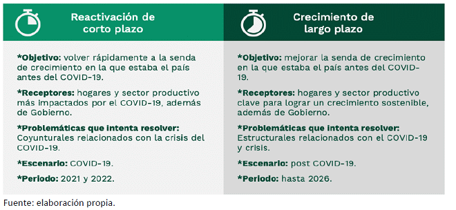En consecuencia, la Política para la Reactivación y el Crecimiento Sostenible e Incluyente tiene por objetivo desarrollar capacidades en los hogares, el aparato productivo el marco institucional y el desarrollo digital para que, en el corto plazo, el país pueda retomar la ruta de desarrollo que estaba recorriendo cuando fue golpeado por el COVID-19 y que, en el largo plazo, transite hacia un crecimiento más sostenible e incluyente que además tenga la habilidad para responder adecuadamente a choques futuros de gran impacto.