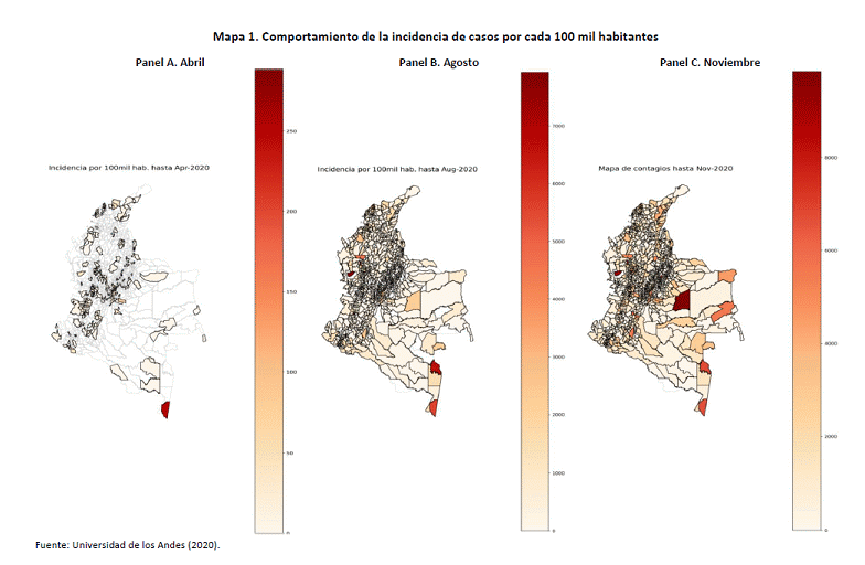 137. Este estudio usa un modelo SEAIR para simular la transmisión del COVID-19 entre 321 municipios del país, estimando parámetros importantes del proceso de transmisión del SARS-CoV2 en el espacio y el tiempo, combinados con técnicas para hacer predicciones en tiempo real. Los datos corresponden a los reportes diarios de nuevos infectados del INS; el movimiento entre regiones se tiene en cuenta usando datos de movilidad extraídos de Facebook. Los parámetros estimados incluyen, entre las medidas más críticas del modelo, tasas de contacto variables en el tiempo, proporción de reportes sintomáticos y proporción de movimientos reportados entre municipios (Cascante, Bravo-Vega, Cordovez, & Santos-Vega, 2020).