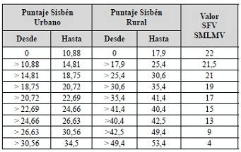 1. El monto del SFV que otorgue el Fondo Nacional de Vivienda - Fonvivienda, con cargo a los recursos del Presupuesto Nacional, en el marco de Concursos de Esfuerzo Territorial Nacional o Departamental, se determinará teniendo en cuenta el puntaje Sisbén vigente del respectivo jefe del hogar postulante, y la modalidad de asignación del SFV, así: