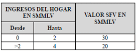 a) A los hogares con ingresos de hasta dos (2) SMLMV, se asignará un subsidio familiar de vivienda por valor de hasta treinta (30) SMLMV;