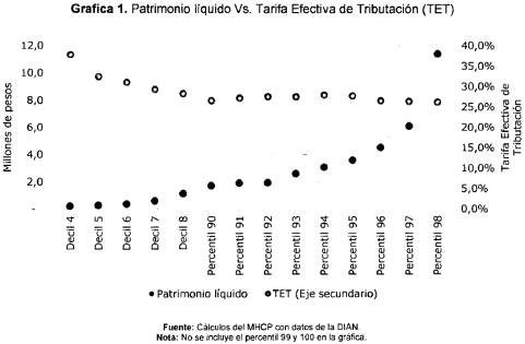 Que, con información de agregados de renta proporcionada por la DIAN, se evidencia que para el año 2024 cerca del 0,2% de las personas jurídicas responsables del impuesto de renta y complementarios, poseían cerca del 54,6% del patrimonio líquido total agregado. Además, el percentil 100 de personas jurídicas tenían para este año, una TET de 21,3%, la cual está cerca de 7% por debajo de la TET promedio del total de personas jurídicas (28,0%).