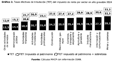 Que de acuerdo con los cálculos del Ministerio de Hacienda y la información suministrada por la Dirección de Impuestos y Aduanas Nacionales, se evidencia que las instituciones que desarrollan la actividad financiera, continúan ubicándose en una posición favorable en términos de tasas efectivas del impuesto sobre la renta, ocupando el tercer y cuarto lugar entre los sectores económicos con menor carga tributaria en 2024 (Gráfico 2). La evidencia empírica sugiere la persistencia de asimetrías relevantes en la distribución sectorial de la carga tributaria, lo que abre espacio a la adopción de medidas correctivas adicionales.