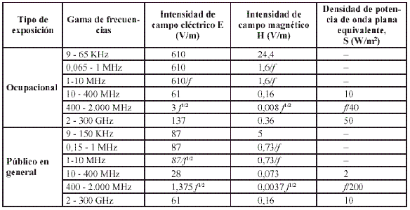 Límites máximos de exposición según la frecuencia de operación.