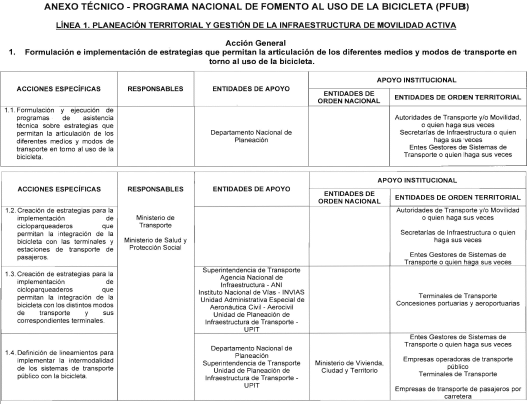 1. Fomentar la planeación territorial y la gestión de la infraestructura de manera que estimule la articulación de los diferentes medios de transporte junto con la bicicleta, el crecimiento de redes de ciclo-infraestructura y la sostenibilidad de los sistemas de bicicletas compartidas en los territorios. Lo anterior, tendrá en cuenta los desarrollos y avances contenidos en los instrumentos de planeación de cada ente territorial.
