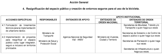 4. Acción general: Resignificación del espacio público y creación de entornos seguros para el uso de la bicicleta.