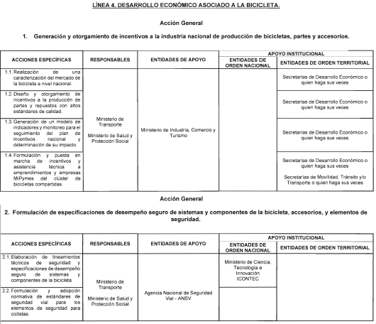 4. Incentivar el desarrollo económico en torno a la bicicleta. Con el fin de impulsar la bicicleta como motor económico en las regiones del país, se formularán y otorgarán estímulos para la industria nacional así mismo, se establecerán lineamientos y estrategias para la fabricación de este vehículo no automotor.
