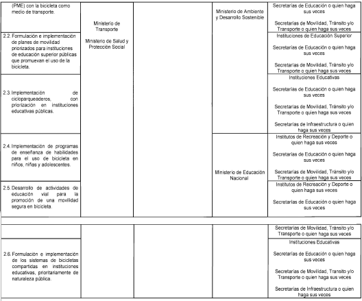 Que en la "Línea de acción 1.1. Incentivo a la movilidad activa" del citado documento, se establecieron una serie de acciones a implementar por el Ministerio de Transporte en conjunto con diferentes entidades del Gobierno nacional, entre las cuales se encuentra el desarrollo de la referida. Estrategia Nacional de Movilidad Activa que contará con los siguientes elementos: i) Implementación de zonas de tráfico calmado e infraestructura dedicada a peatones, (ii) Generación de infraestructura ciclo-inclusiva, (iii) Implementación de sistemas públicos de bicicletas, (iv) Implementación de servicios formales en medios alternativos de transporte e, (v) Implementación de campañas de educación y promoción de valores y prácticas afines a la cultura de la movilidad activa.