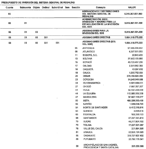 PARÁGRAFO 1o. Mediante el Anexo 1, que hace parte integral del presente decreto, se detallan los recursos de las Asignaciones Directas (20% del SGR) por entidad beneficiaria.