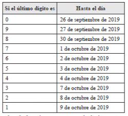 El plazo para la presentación de la declaración del impuesto al patrimonio está comprendido entre el veintiséis (26) de septiembre y el nueve (9) de octubre del mismo año, atendiendo el último dígito del Número de Identificación Tributaria (NIT) del declarante que conste en el Certificado del Registro Único Tributario (RUT), sin tener en cuenta el dígito de verificación.