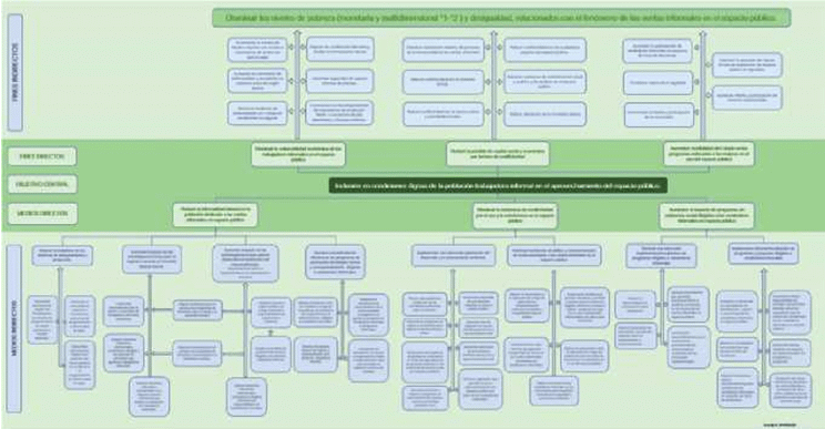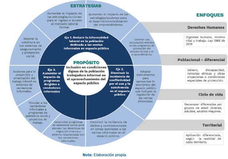 La política pública para los vendedores informales tiene como finalidad esencial, ser una herramienta para el desarrollo de soluciones a la situación de precariedad de este sector y apunta a ampliar las capacidades y oportunidades de las personas hacia condiciones de igualdad y equidad, disminuyendo los niveles de pobreza y desigualdad. Mejorar las condiciones para la inclusión de la población trabajadora informal en el aprovechamiento del espacio público, y reconociendo la necesidad de conciliar dos derechos fundamentales en constante conflicto, por un lado, el derecho al trabajo y al mínimo vital, y por otro, el derecho al gozo del e spacio público.